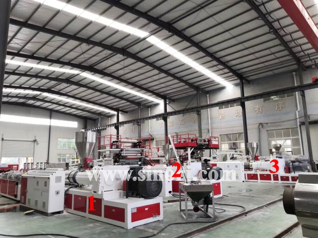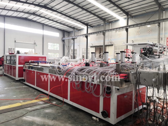 等待發(fā)貨的三套設(shè)備:PVC木塑中空門板設(shè)備,仿大理石設(shè)備,SPC地板設(shè)備。